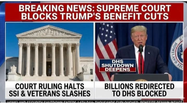 In a dramatic development tied to the ongoing U.S. government funding crisis, the **Supreme Court has blocked a controversial proposal by President Donald Trump’s administration to cut Supplemental Security Income (SSI) and veterans benefits** and redirect those funds to the **Department of Homeland Security (DHS)** — a move that was tied to negotiations over extended funding for DHS as part of the broader federal budget standoff.